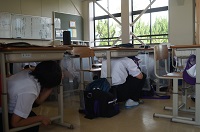 ナラ・シェイクアウト(奈良県いっせい地震行動訓練) 2022年07月12日(火) |新着順| シェイクアウト訓練とは、2008年にアメリカで始まった地震に備える防災訓練で、ホームページなどを通じて防災の普及啓発を図り、決められた時刻に一斉に参加者全員が机の下に隠れるなど身の安全を図る行動を実践していただき、自宅や地域、職場などでの日頃の防災対策を確認するきっかけづくりにしていただく訓練です。 天理中学校でも例年、この訓練に参加しています。今年は、7月11日(月)10時30分の実施に合わせて、3時間目の途中で行いました。校内放送で、笛の音の後、「訓練、地震発生」の合図で、授業をストップし、生徒たちは机の下にもぐり頭を保護する訓練をしました。「地震はおさまりました」の放送の後、授業担当者から地震発生時の身を守る行動についての注意があり、授業を再開しました。万が一に備えて、自分の命を守る行動をしっかりと身につけておきましょう。 « 前のページ人権教育講演会次のページ »吹奏楽部 フレッシュコンサート