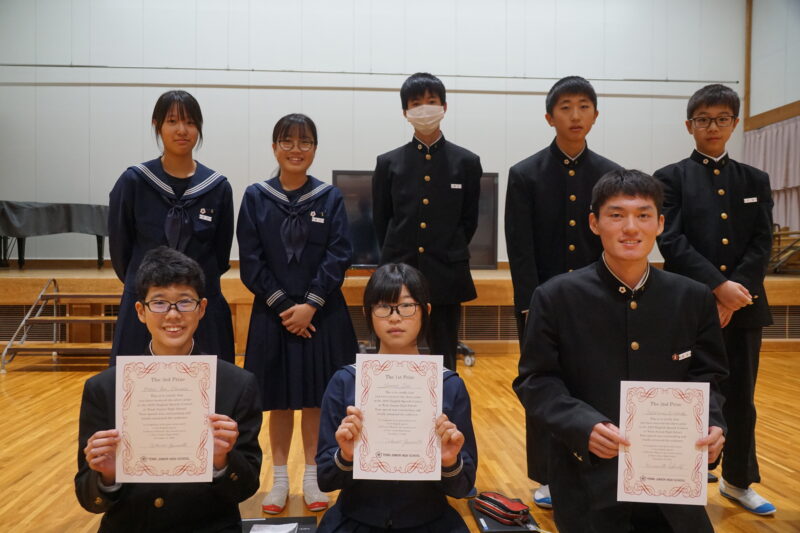 第2学年 英語スピーチコンテスト 2025年11月19日(水) |新着順| 11月18日(火)3限目に第2学年において、英語スピーチコンテストを開催しました。この行事は天理大学との連携行事であり、今年度も天理大学国際学部外国語学科英米語専攻准教授の山本享史先生が審査に来てくださいました。スピーチの演題は「The place I want to go(私が行ってみたいところ)」。事前に各クラスでスピーチ発表会を行い、各クラス2名、計8名の代表者を決定しました。代表者たちは、自分が行きたい場所やその魅力を伝えるためのスライドを作成し、スクリーンに映し出しながら学年全体の前でスピーチを披露しました。その後、天理大学生による模範スピーチを鑑賞し、最後は山本先生から優秀であった発表者に賞状が手渡されました。 #英語スピーチコンテスト #天理大学 #国際交流 #スピーチ発表会 #英語学習 #行事レポート #学校生活 « 前のページ音楽会・合唱練習