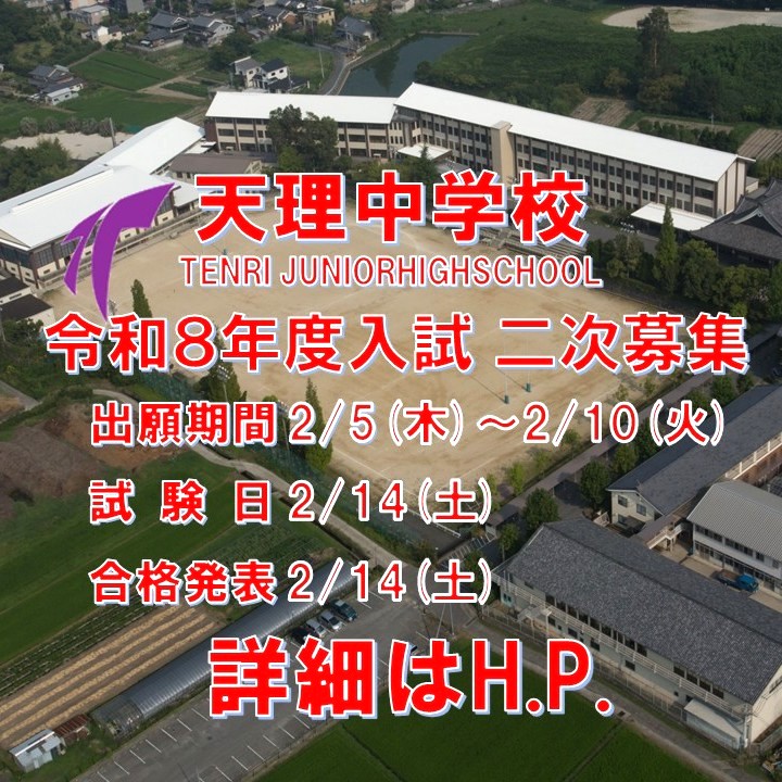 天理中学校入試・二次募集 2026年02月02日(月) |お知らせ|新着順| 二次募集を以下の日程で行います。詳細は本校ホームページをご参照ください。 出願期間 2/5(木)~2/10(火) 試 験 2/14(土) 合格発表 2/14(土) #天理中学校 #天中 #奈良県私学 #中学受験 #二次募集 « 前のページ弦楽部 第13回定期演奏会次のページ »吹奏楽部・県アンサンブルコンテスト金賞