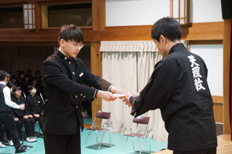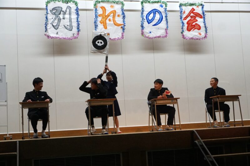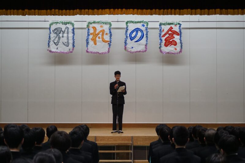 別れの会 2026年03月13日(金) |新着順| 3月8日(土)、毎年恒例の「別れの会」が講堂で開催されました。 開会挨拶の後、オープニングは生徒会役員による漫才とダンス。続いてクラス対抗ゲームが行われ、クジで選ばれた出場者が協力してゲームに挑戦。講堂は大いに盛り上がりました。その後、三年生の代表から記念品「冷水機一台」の目録が校長先生に手渡されました。 休憩をはさんでスライド上映。三年生は大切な思い出がつまったスライドを思い思いに見つめていました。最後は三年生代表からの謝辞。三年間の感謝の気持ちを伝えてくれました。 #天理中学校 #天中 #奈良県私学 #中学受験 #学校行事 « 前のページ天理学園英語スピーチ・レシテーション大会